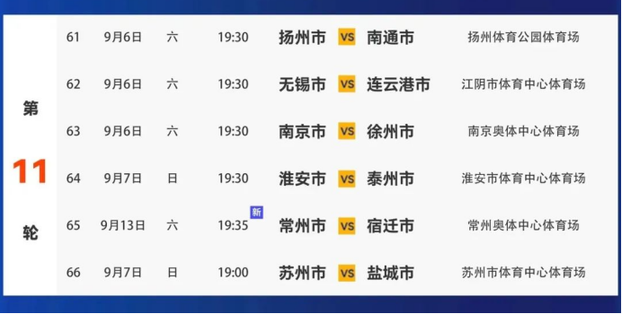 上周末江苏省城市足球联赛第十轮比赛让各位球迷意犹未尽本周末又将开启第十一轮的争夺临近常规赛收官阶段八强席位争夺拭目以待一起来看最新前瞻分析!⚽ 扬州VS南通时间:9月6日(周六)19:30地点:扬州体育公园体育场精彩看点:南通队总积分27分,位列积分榜榜首。扬州队目前积7分,若想晋级八强,需要取得后面3场全胜。⚽ 无锡VS连云港时间:9月6日(周六)19:3...
